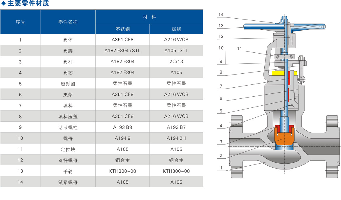 ⑨阀杆螺母:通常情况下,阀杆螺母材料采用铜合金。可以根据用户要求采用高镍铸铁等材料,对于高压大口径的截止阀:阀杆螺母和阀杆之间设计有滚动轴承,可以有效减小截止阀的开启力矩使阀门可以轻松开关。