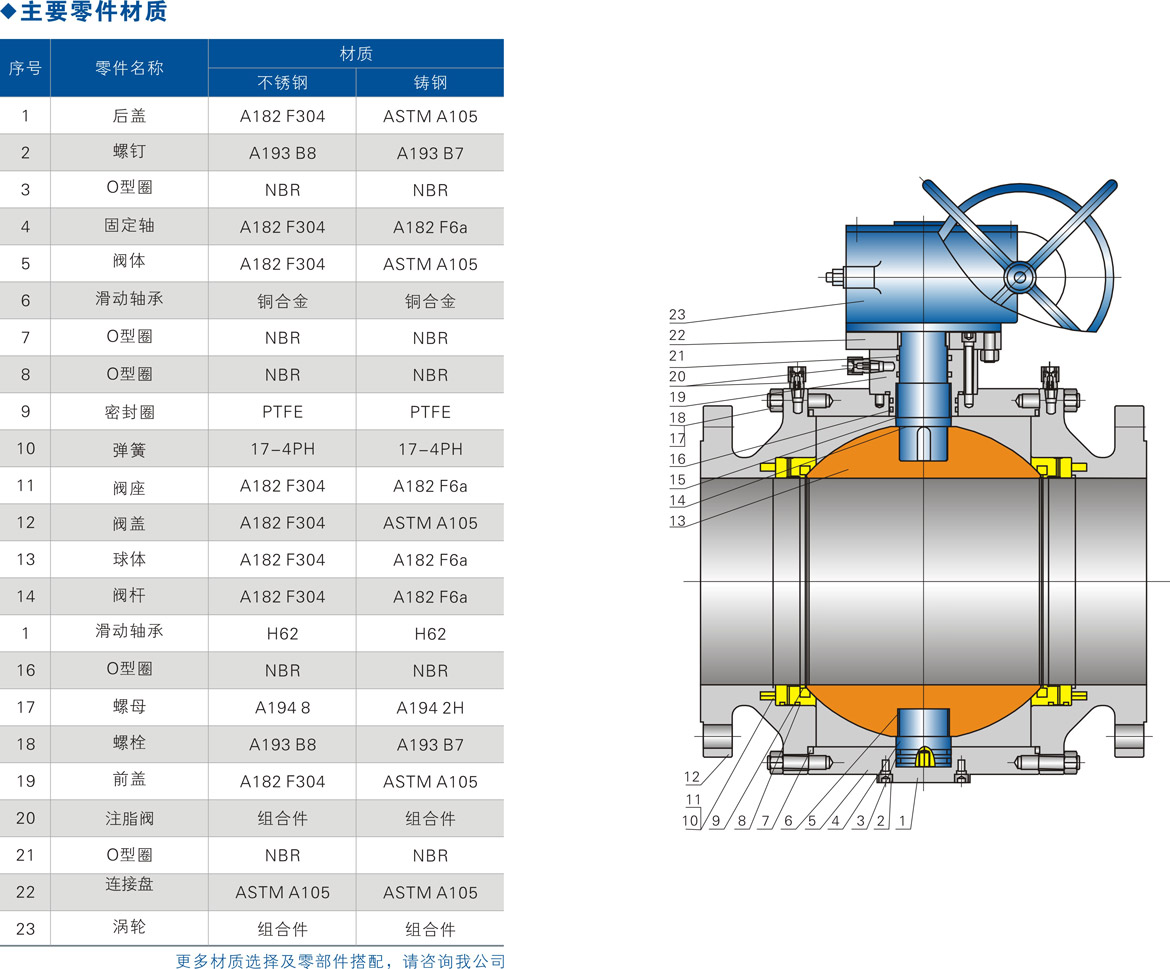 ②锻钢固定球阀与浮动球阀相比,工作时,阀前流体压力在球体上产生的作用力全部传递给上、下阀杆,不会使球体向阀座移动,因而阀座不会承受过大的压力,所以固定球阀的带压开启力矩小、阀座变形小,密封性能稳定、使用寿命长,适用于高压、大口径场合。