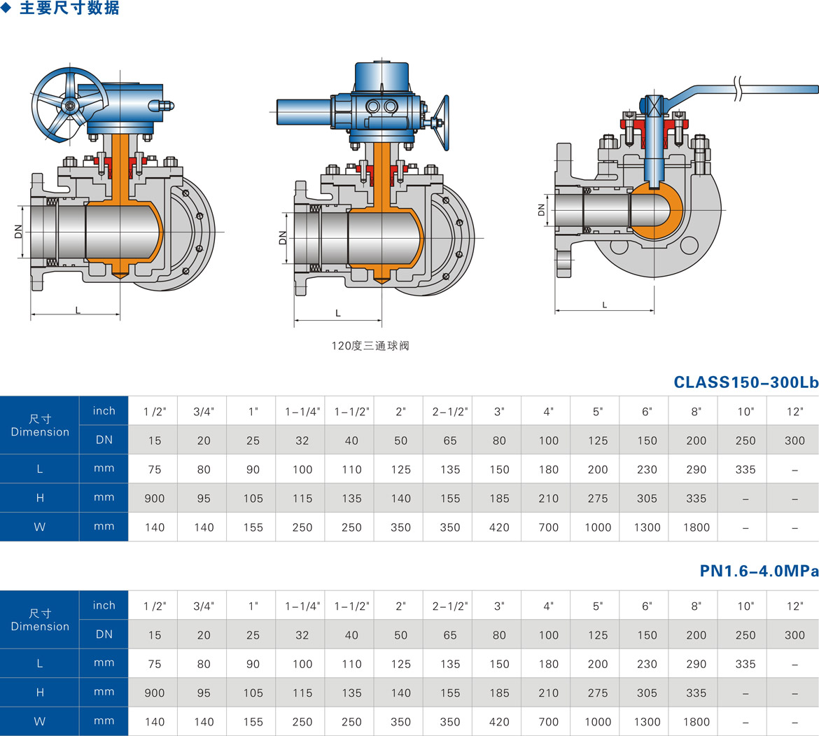 ②球阀三个流道之间夹角为120°等分,三个流道均可作为出、入口通用,增强管道系统的灵活性和拓展性。
